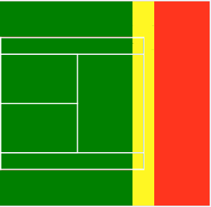The yellow zone is really a place of transition, which is why it appears so narrow in the graphic above. It extends a few short feet either side of the baseline, and generally speaking we don’t want to remain in the yellow zone for too long. Doing so means we are either taking up poor position off our own weaker shots, or that we are not taking advantage of opportunities to attack. So what sort of shot should we strive to hit from the yellow zone? Generally speaking we are looking to attempt controlled aggression. If I’m standing in the center of the court in the yellow zone and my opponent hits the ball to my strength, I might choose a more aggressive shot. If I’m on the run in the yellow zone hitting with my weaker side, then I would choose a more passive or defensive shot.