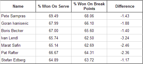 Surprising isn’t it? As it turns out Pete wasn’t such a clutch player after all. His performance didn’t drop precipitously, but it didn’t elevate either. Pete had the reputation of a guy who would step up and serve three aces if he got down love-40. As it turns out, he’d pretty much just do his usual thing, give or take about 1.5%. Now granted the stats for these ‘legends’ are across their entire careers, which makes them both statistically more significant but also encompasses periods when they were not at their peak. Regardless the data is interesting.