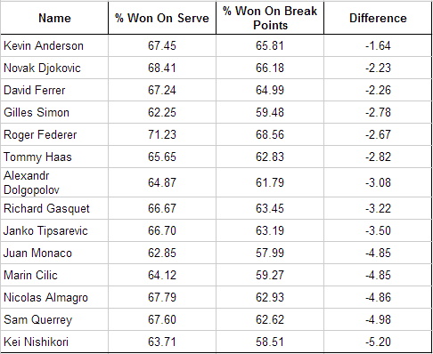 The first thing that stands out is that so many of the top players underperform on break points. And for some of them it isn’t just a small drop in performance that could easily be explained away by luck. Kei Nishkori’s chances of winning the point on break drop by a full 5%! That’s not a dip in performance – that’s a valley. But Nishikori isn’t the only culprit. Cilic, Almagro, Querry and Monaco are all close behind him at roughly 5% also. While Dolgopolov’s flashy-yet-risky playstyle may rightfully land him on the list, it is shocking to see both Djokovic and Federer here. Two great champions with a history of winning big matches, and yet both drop their performance on break points.