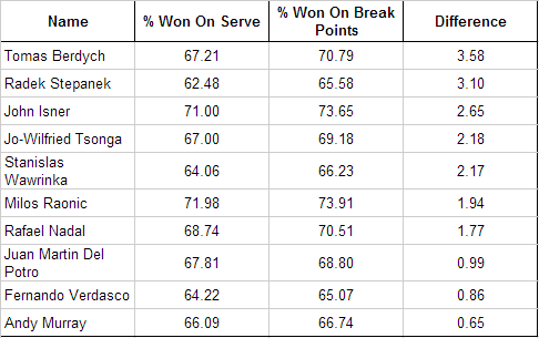 One of the reasons we don’t expect to see Berdych at the top of the list is that he has a reputation for mentally wandering off during matches at times. Tsonga is much the same way – for all his talent he can get distracted on occasion. Verdasco could be accused of this also. So why do they up their game on big points? Because the appearance of a break point serves as a focusing mechanism for them. Under the pressure they have cause to bring their full attention to the point at hand, and in doing so perform better than on average when they are less likely to be concentrating properly.