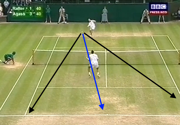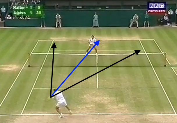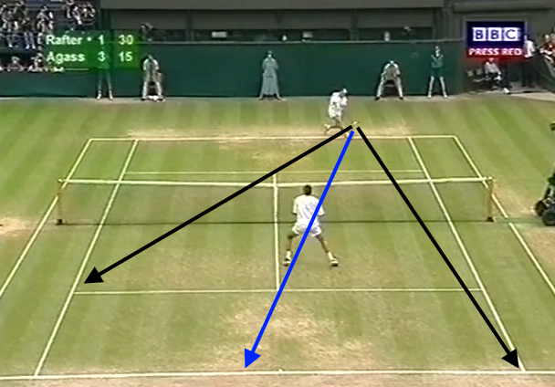 We can see here in the picture that the black arrows indicate roughly the two opposite extremes of angle that Agassi can possible hit his passing shot into. The blue line represents the approximate bisection of the angle, and as we can see Rafter is standing smack-dab on the blue line. In doing so, he takes away the easiest shots. Of all the possible places Agassi can hit the ball, he is now forced to hit away from the center of his options, and as far towards the edges (and hence out) as Rafter can make him.