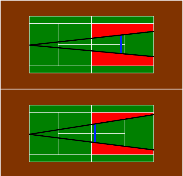 The blue bar in the pictures above represent the one-step reach of the net player upon approaching the net – that is to say the lateral space he or she can cover with a single step. The red area represents the portion of the court not covered by the net player. Noting that the blue bar is the same size in both images, we can see that the red space is significantly smaller in the second image. Just how much of a difference does this make? Let’s put some numbers to it!