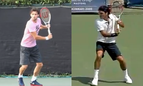 The racket drop on the backhand for both Dimitrov (L) and Federer (R)