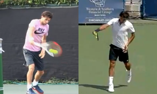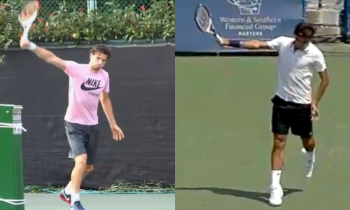 The backhand follow-through of Dimitrov (L) and Federer (R)